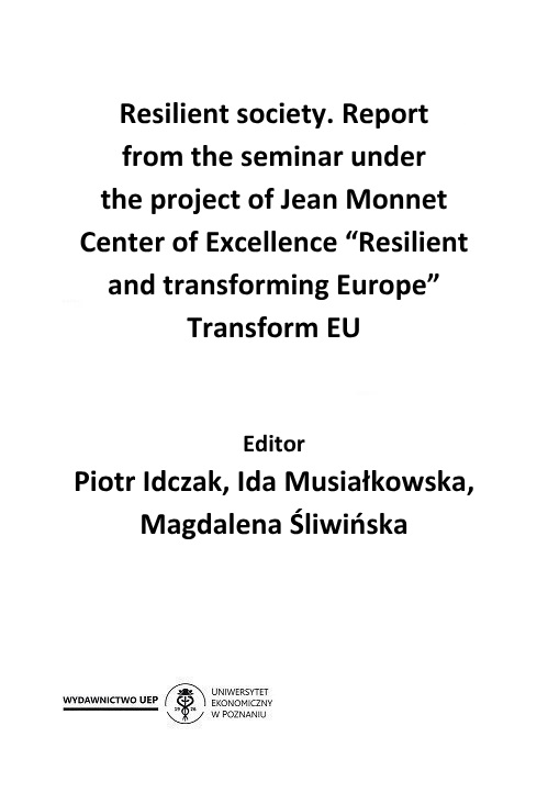 Idczak, P., Musiałkowska, I. and Śliwińska, M. (Ed.).Resilient society. Report from the seminar under the project of Jean Monnet Center of Excellence “Resilient and transforming Europe” Transform EU. Poznań University of Economics and Business Press.